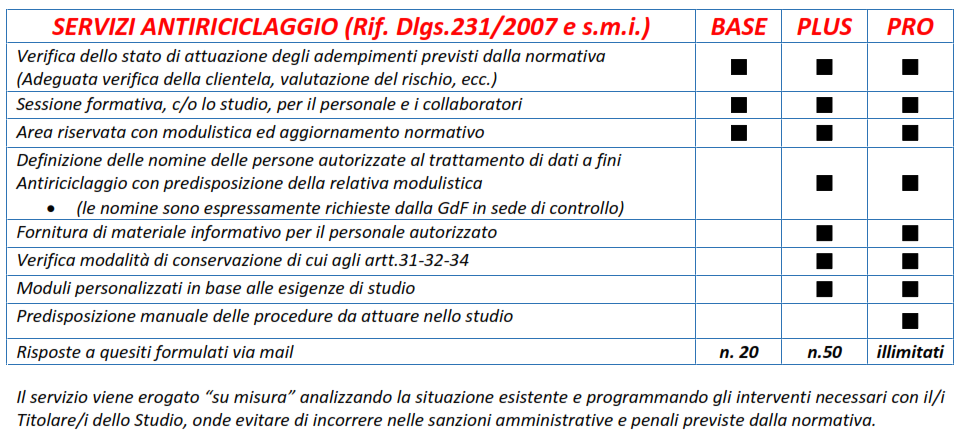 - A supporto dei nostri Clienti siamo in grado di mettere a disposizione specifico software che permette di elaborare la documentazione richiesta dalle Regole Tecniche (Valutazione del rischio di studio, della clientela ecc.).